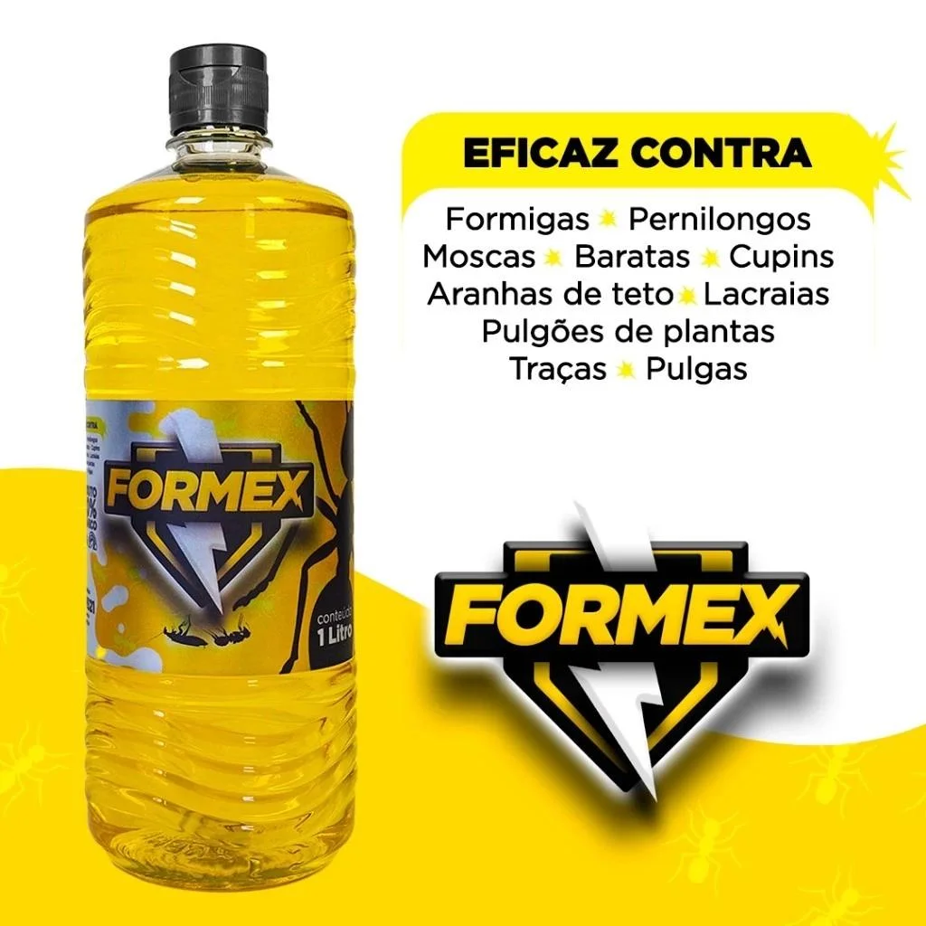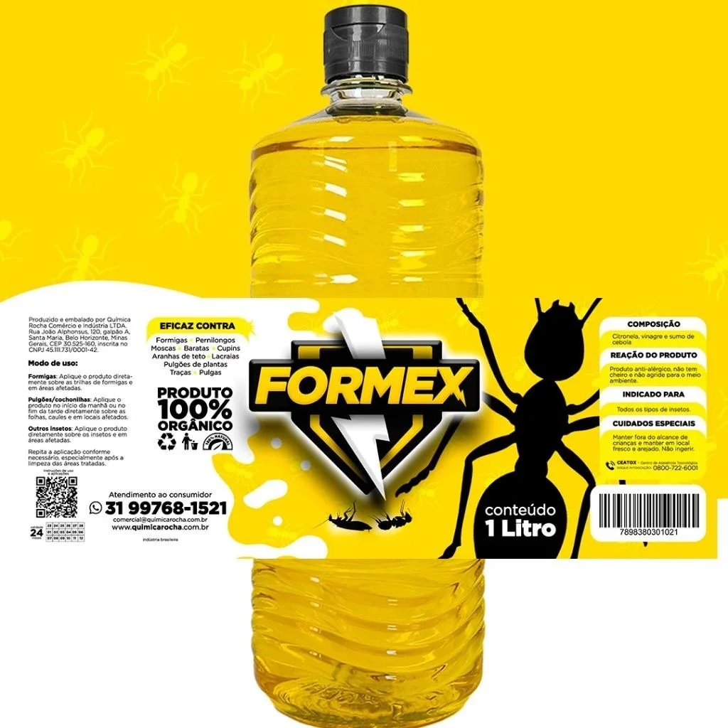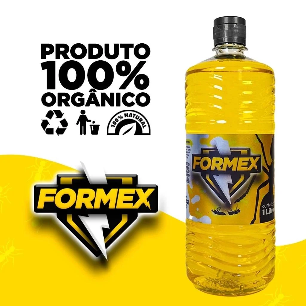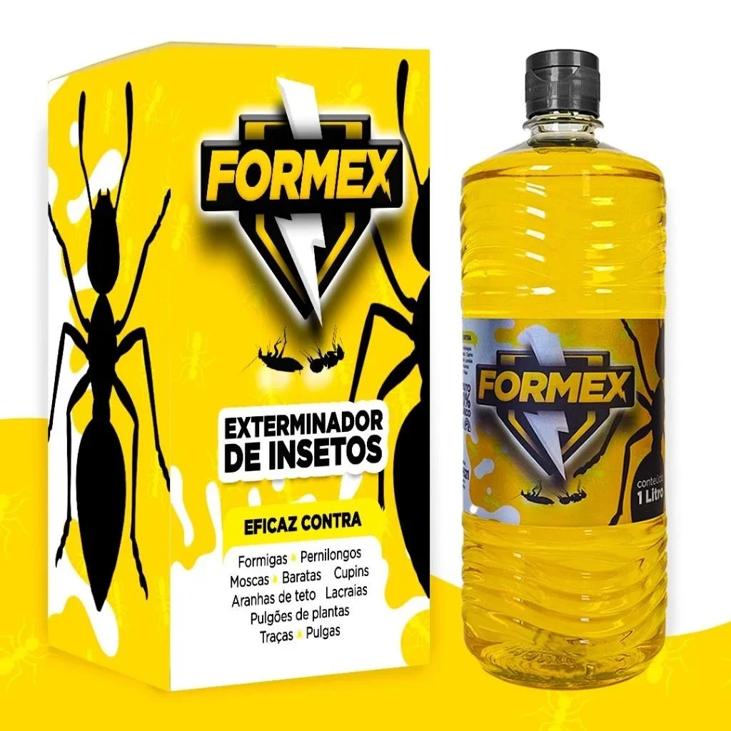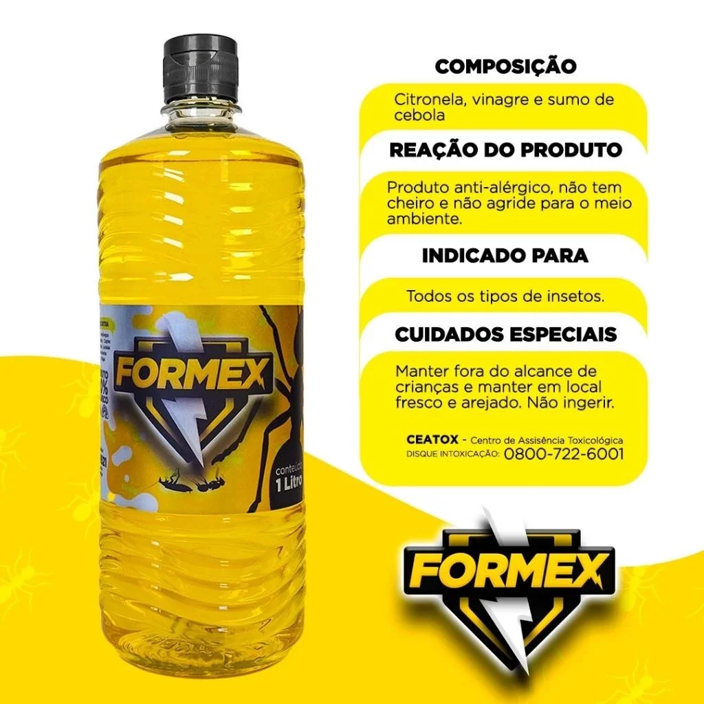 FORMEX EXTERMINADOR DE BARATAS, FORMIGAS E INSETOS 🚫 Livre-se de formigas e outros insetos indesejados de forma natural! ✅ 100% natural e sem cheiro – Seguro para pets, plantas e sua família. ✅ Eficiente contra: Formigas, baratas, moscas, lagartas, aranhas, traças, cupins e mais. ✅ Pronto para uso – Acompanha borrifador para facilitar a aplicação. ✅ Sem odor – Não deixa cheiro desagradável no ambiente. ✅ Para ambientes internos e externos – Use onde precisar! 🔹 Composição: Sumo de cebola, vinagre e citronela. 🔹 Volume: 1 litro + 1 borrifador incluso. 🛒 Garanta já o seu e mantenha sua casa livre de insetos com segurança!