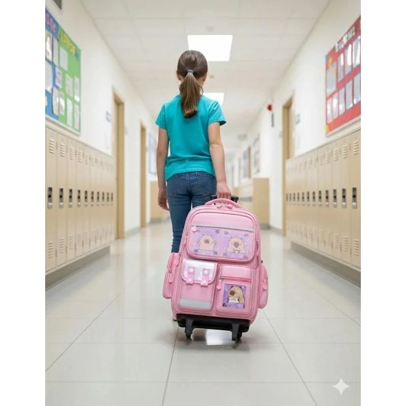 Mochila Escolar Capivara IMPORTANTE: As imagens da capivara são apenas um complemento decorativo para dar estilo ao design, não são bordadas .Os botões frontais também não são fixos, servem somente como detalhe. Encante-se com a fofura e praticidade da Mochila Escolar Capivara! Disponível nas cores rosa e caramelo, ela vem com rodinhas resistentes, vários bolsos espaçosos e um chaveiro de capivara super fofo que dá um toque especial ao visual. Ideal para escola, viagens ou passeios — combina estilo, conforto e muita diversão! Destaques: Design exclusivo com tema de capivara Rodinhas que facilitam o transporte Material resistente e acabamento de qualidade Vários compartimentos para melhor organização Acompanha chaveiro capivara