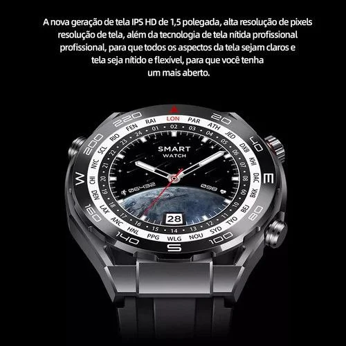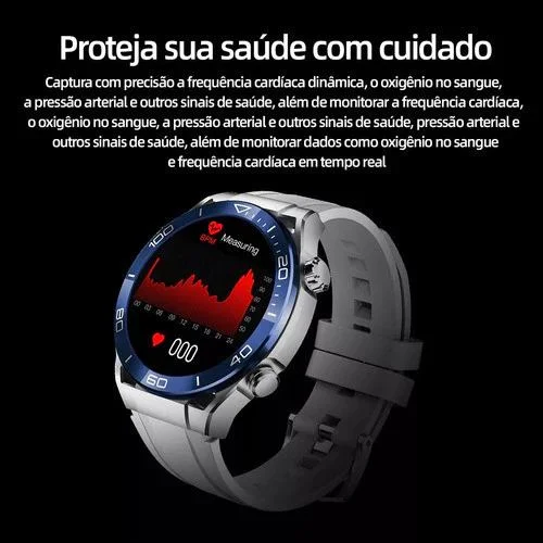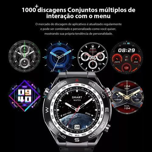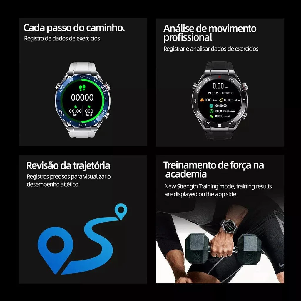 Relógio inteligente com monitor cardíaco 24h, GPS integrado, resistente à água IP68 e mais de 100 modos esportivos.