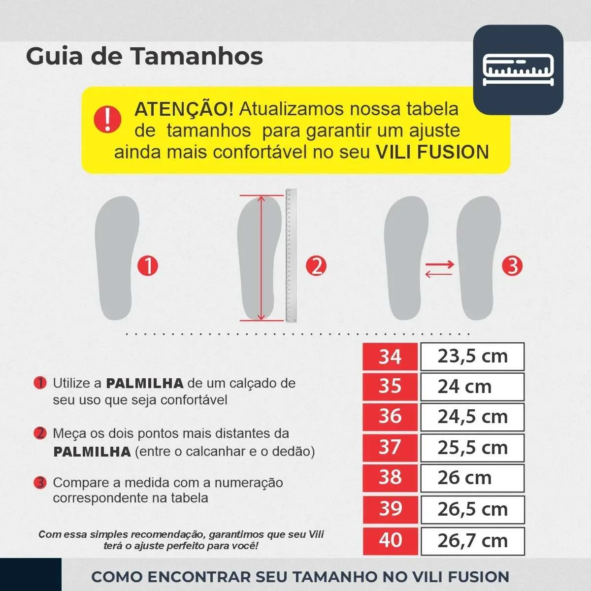 Conheça o Tênis Feminino VILI FusionDesenvolvido para unir estilo, conforto e performance. Ideal para caminhadas, corridas e atividades do dia a dia, o VILI Fusion combina um design vibrante com alta tecnologia. Com opções de cores modernas, como roxo profundo e rosa vibrante, ele traz um cabedal de malha respirável, que mantém os pés frescos e confortáveis.Sua entressola de dupla densidade oferece amortecimento avançado, absorvendo impactos e proporcionando uma pisada leve e controlada. O interior acolchoado e o ajuste anatômico garantem conforto superior, enquanto a sola antiderrapante e durável oferece tração em diversos tipos de terreno.Leve e flexível, o VILI Fusion é perfeito para quem busca desempenho sem abrir mão do estilo, seja em atividades físicas ou no uso casual.Especificações Técnicas:* Cabedal: Nylon respirável, que proporciona mais resistência e gera alto nível de maciez e maior sensação de conforto.* Palmilha em E.V.A. espumada, para maior conforto dos seus pés.* Solado Micro Expandido Antiderrapante, com alta resistência, durabilidade e conforto.* Estilo: Tênis Casual Esportivo* Marca: Vili* Gênero: FemininoPara garantir o máximo conforto ao escolher o tênis VILI Fusion, recomendamos optar por um número maior do que o habitual.Exemplo: se você usa tamanho 36, escolha o tamanho 37.Confira nossa tabela de medidas da palmilha:34: 23.5 cm35: 24.0 cm36: 24,5 cm37: 25,5 cm38: 26,0 cm39: 26,5 cm40: 26,7 cmComo medir: Retire a palmilha de um calçado que você já usa, meça o comprimento total e compare com as medidas da tabela para encontrar o tamanho ideal.Com essa simples recomendação, garantimos que seu VILI Fusion será o ajuste perfeito para garantir conforto e qualidade.Cuide bem do seu VILI Fusion com estas dicas simples:1. Limpe com um pano úmido e sabão neutro, evitando lavar por imersão ou mergulho, para não danificar o material e a estrutura do calçado.2. Evite o uso de produtos químicos agressivos que possam danificar o material.3. Deixe secar à sombra para prevenir manchas e marcas permanentes.Dessa forma, você manterá seu VILI Fusion em ótimas condições, garantindo durabilidade e estilo em cada passo."Garantia de fábrica: 90 dias