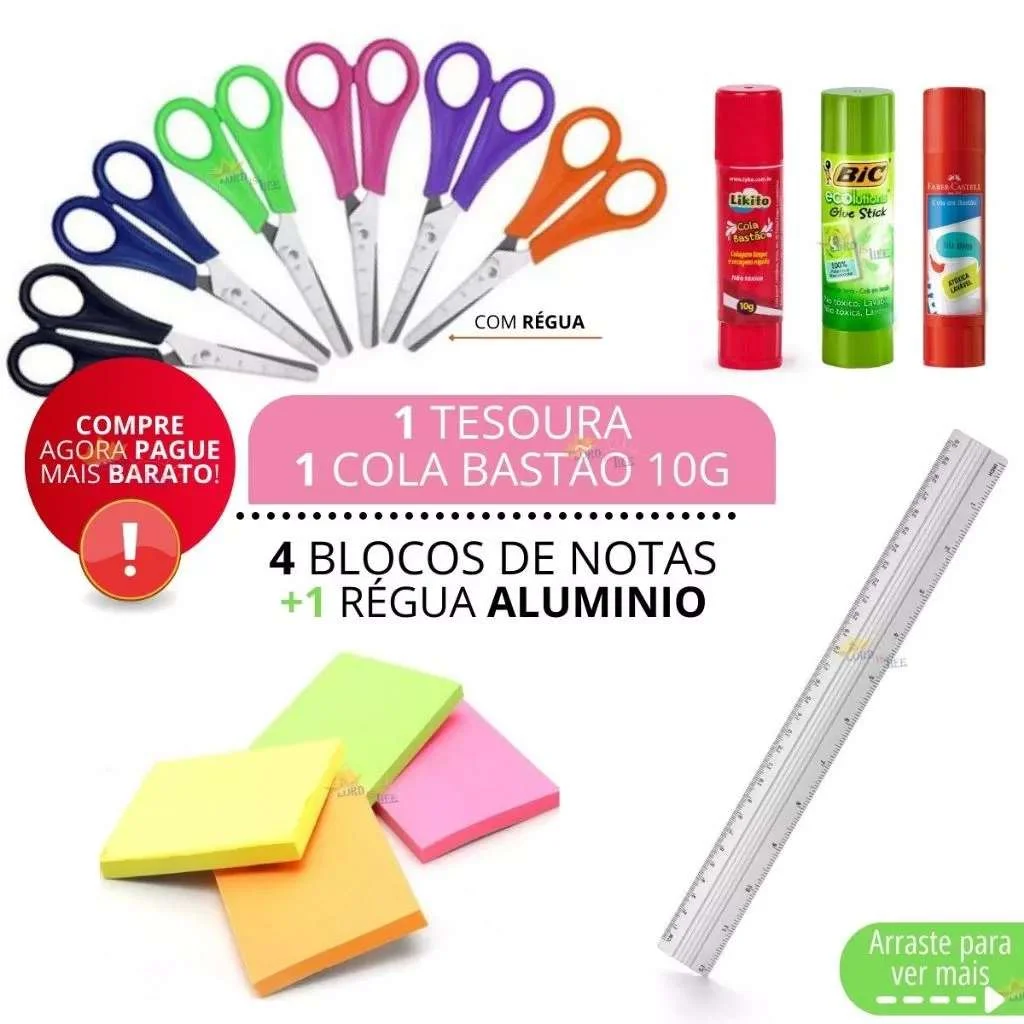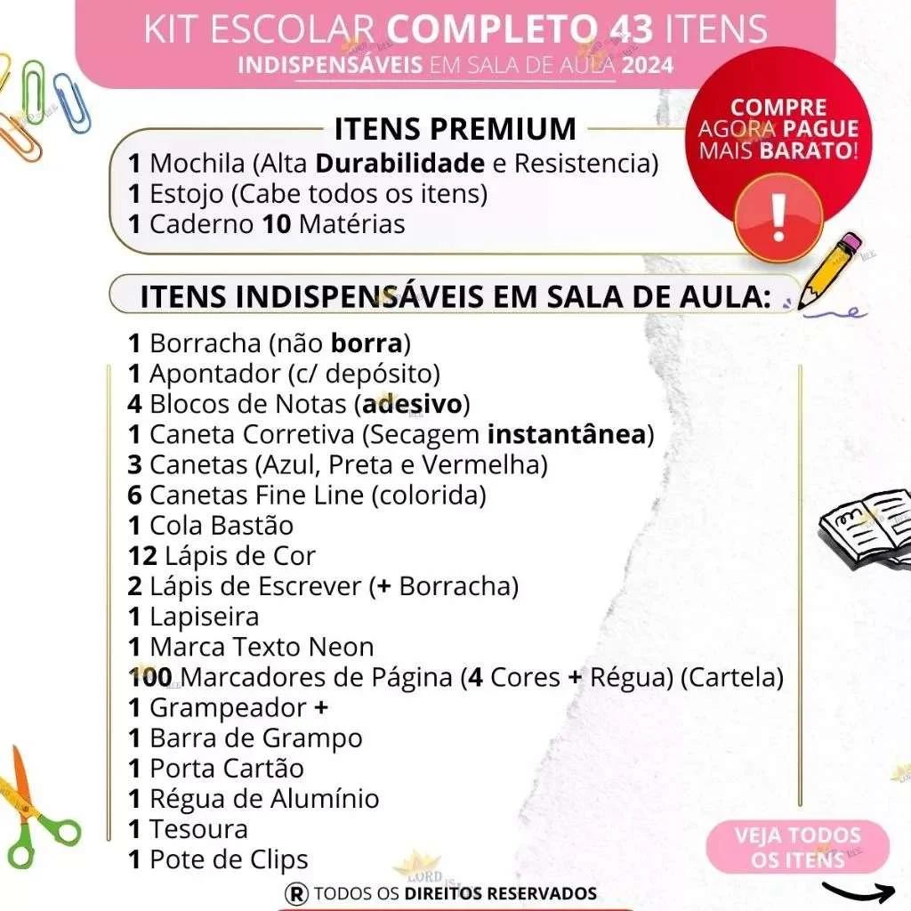 Kit Material Escolar Feminino Completo! 43 Itens com Tudo que você precisa em um único Kit.Todos os itens foram criteriosamente selecionados por nós, são de altíssima necessidade para o aluno, em sala de aula e indispensáveis! Economize tempo e dinheiro, esse é o melhor kit volta às aulas, com itens de qualidade com o melhor custo benefício do mercado.No total são 43 ITENS Unitários:ITENS PREMIUM: 1 Mochila Escolar (Alta Durabilidade e Resistencia) (Opcional)1 Estojo Feminino (Cabe todos os itens)1 Caderno Feminino 10 Matérias.PARA ESCREVER:- 1 Lapiseira- 1 Marca Texto- 2 Lápis de escrever (+ Borracha)- 3 Canetas Esferográficas (Azul, Preta e Vermelha)- 6 Canetas Fine Line (colorida)- 12 Lápis de cor.OUTROS ITENS INDISPENSÁVEIS EM SALA DE AULA: - 1 Borracha (não borra)- 1 Apontador (c/ depósito)- 1 Tesoura- 1 Régua de Alumínio- 1 Cola Bastão- 1 Caneta Corretiva (Secagem instantânea)- 1 Porta Cartão Para Estudante- 4 Blocos de Notas (adesivo)- 100 Marcadores de Página (4 Cores + Régua) (1 Cartela)- 1 Grampeador +- 1 Barra de Grampo (Vamos coloca-la no Grampeador para que não quebre)- 1 Pote de ClipsGARANTIMOS QUE VOCÊ IRÁ RECEBER TODOS ESSES ITENS DESCRITOS ACIMA(selecione a variação correta no anúncio da quantidade desejada. Em caso de falta de estoque o item será trocado por outro)Compre agora e economize em suas compra!—-ATENÇÃO: As cores, Tipos, Modelos, Estampas e Marca dos itens serão enviados ALEATORIAMENTE conforme disponível em estoque!—-= = =Entre em nossa loja e confira outros itens de volta às aulas, e ECONOMIZE no FRETE!!= = =Envio em menos de 24h.Temos a pronta entrega. (estoque limitado)As fotos do anúncio são reais dos produtos. (leie a descrição imagem de capa ilustativa)DÚVIDASCaso tenha alguma dúvida mande sua pergunta no Chat da nossa loja, você será respondido o mais rápido possível.⚠️ Caro Cliente você pode encontrar alguém que venda um escolar Kit por um preço menor do que nós, mas garantimos que a qualidade dos itens e o compromisso com você, não será o mesmo!Não se frustre com a sua compra, compre no lugar certo com a qualidade que você merece!Aguardamos a sua compra.